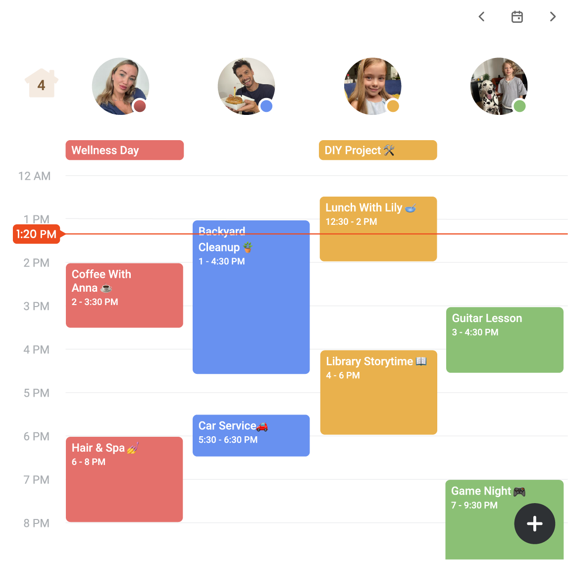 One calendar, up to 8 profiles. See everyone's schedule at one. Easily know who's busy or available for instant family planning.