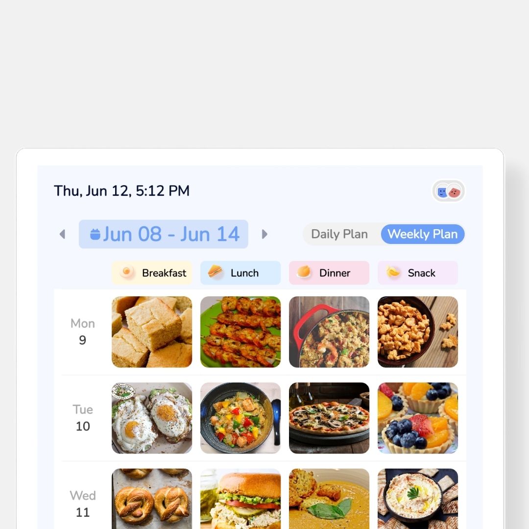 Our meal plan app offers a wide variety of recipes to help you effortlessly plan daily meals for whole family. Everyone can see the day’s menu at a glance.